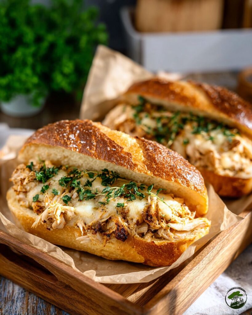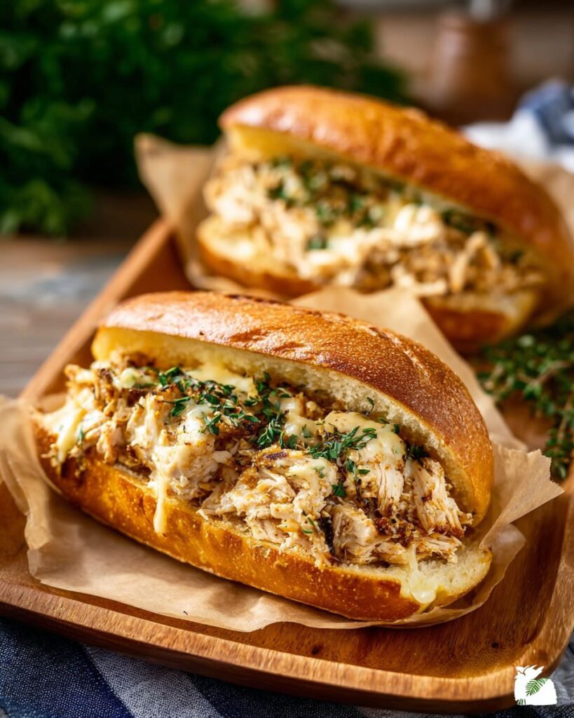 6. Assemble the Sandwiches: Using tongs, place the shredded chicken on hoagie rolls or baguettes, top each with a slice of provolone, and let them melt under the broiler for a few minutes.