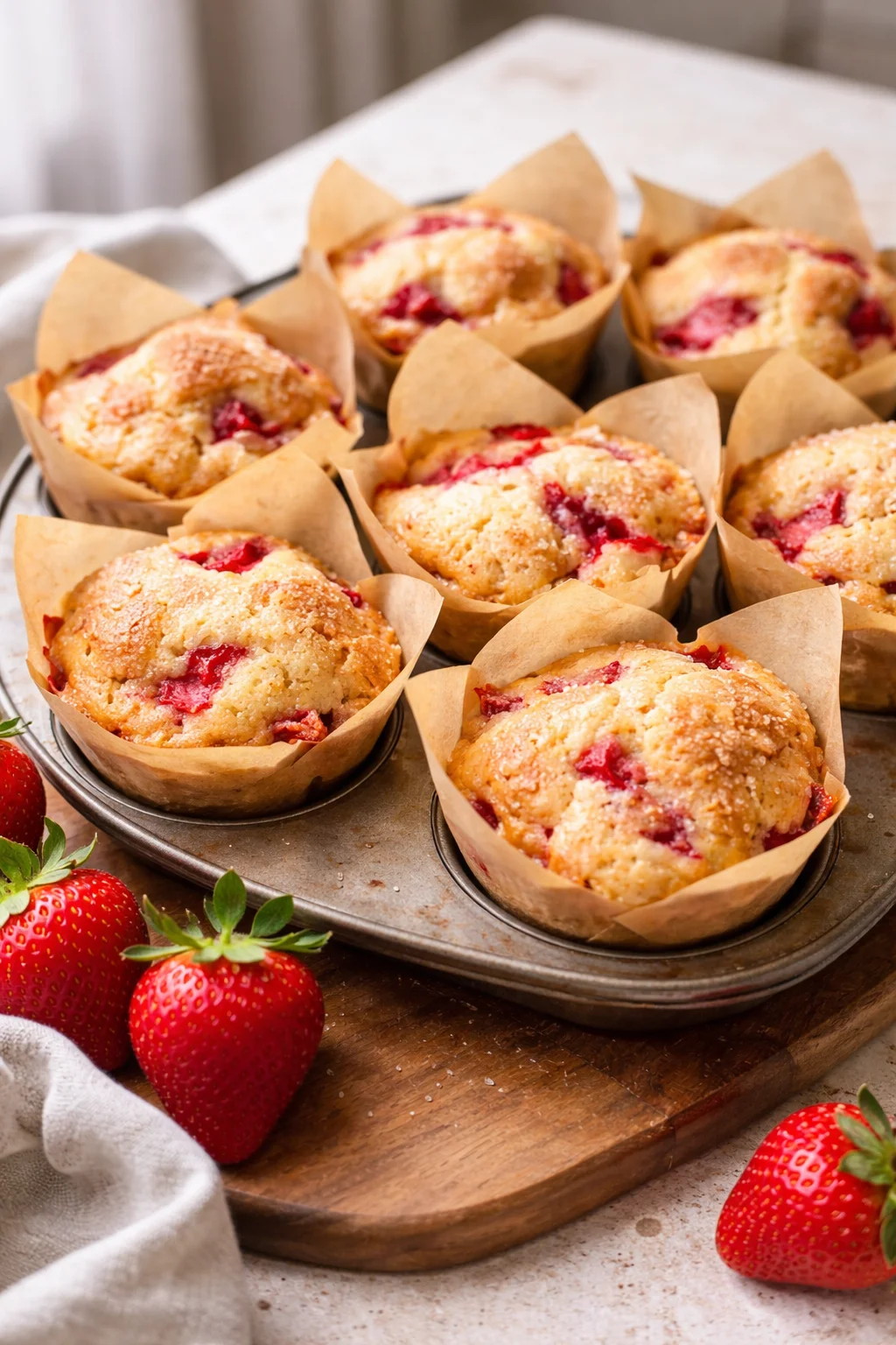 Deliciously tender muffins packed with juicy strawberries, perfect for breakfast or as a treat.