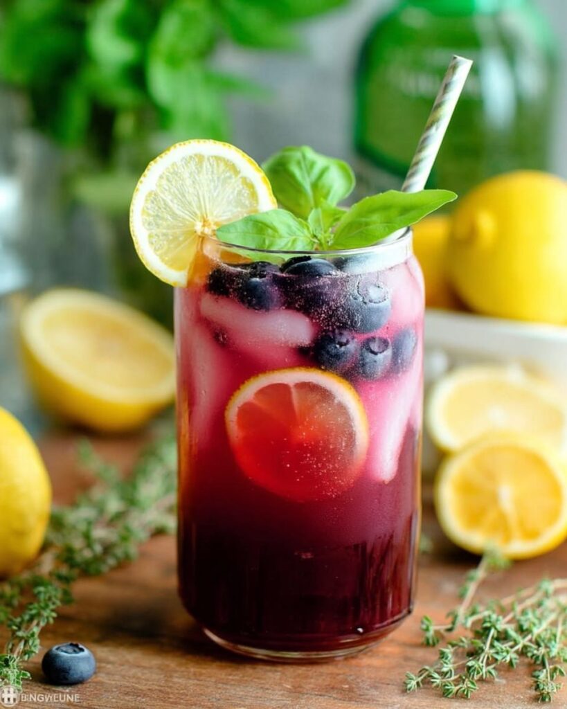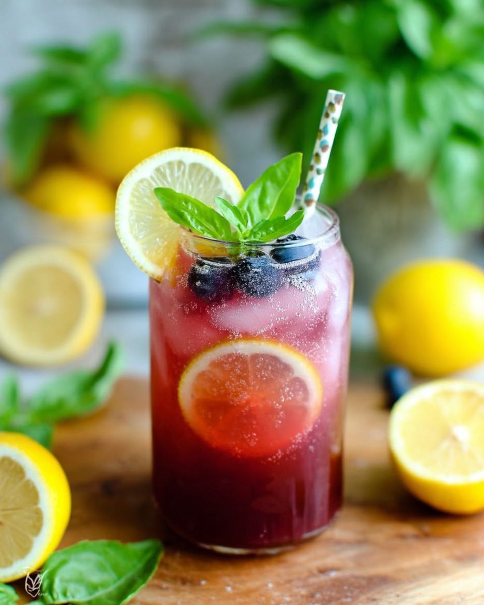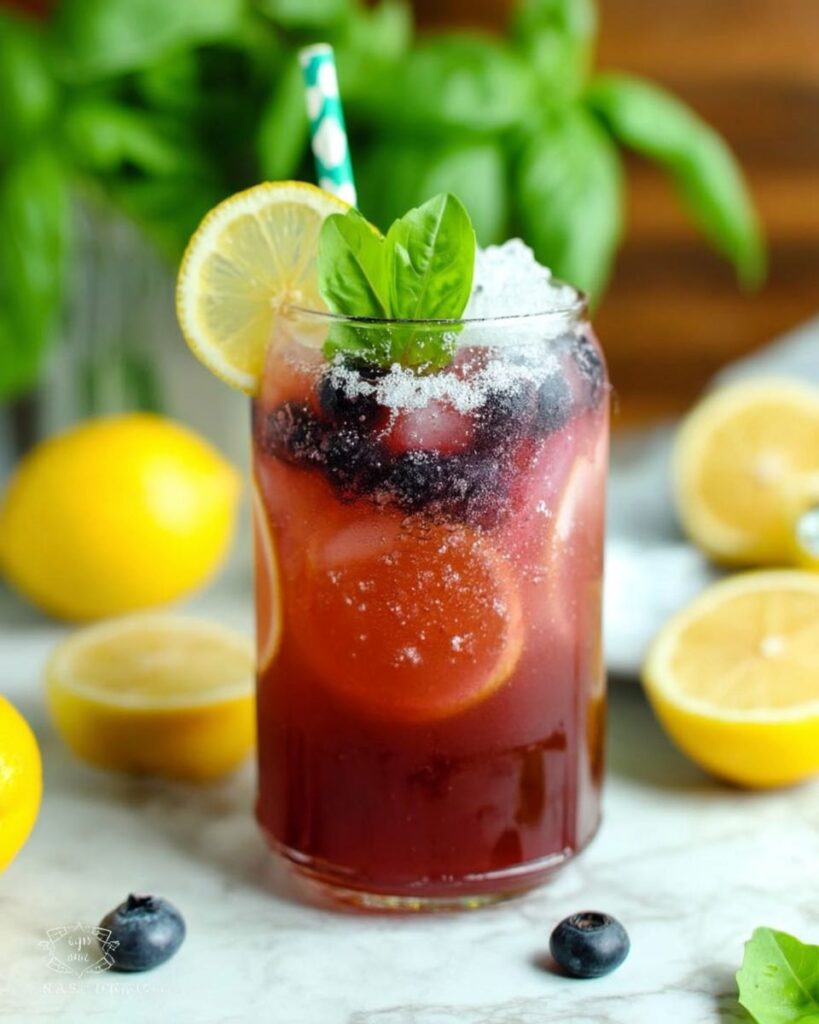 A refreshing blend of sweet blueberries and fragrant basil in a zesty lemonade, perfect for summer gatherings.