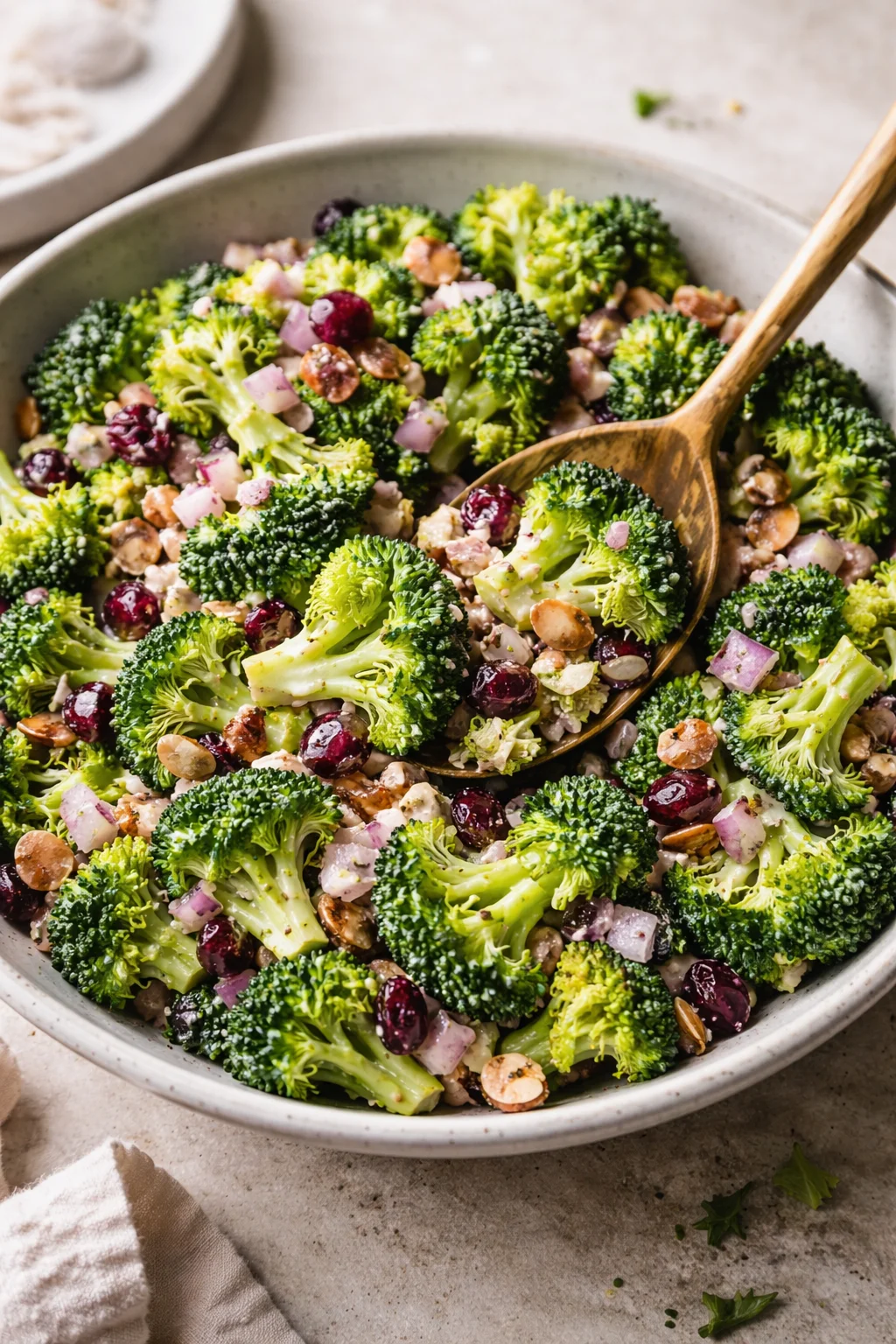 5. Rest and serve: Let the salad sit for at least 10–15 minutes to allow flavors to marry. You’ll notice the dressing soften the broccoli just a touch and the cranberries plump up — that’s when your kitchen starts smelling incredible.