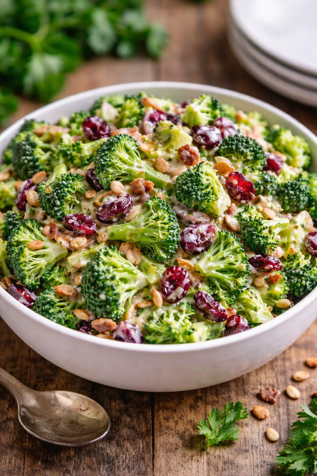 • The texture contrast — crisp broccoli, creamy dressing, chewy dried fruit — makes every bite exciting.