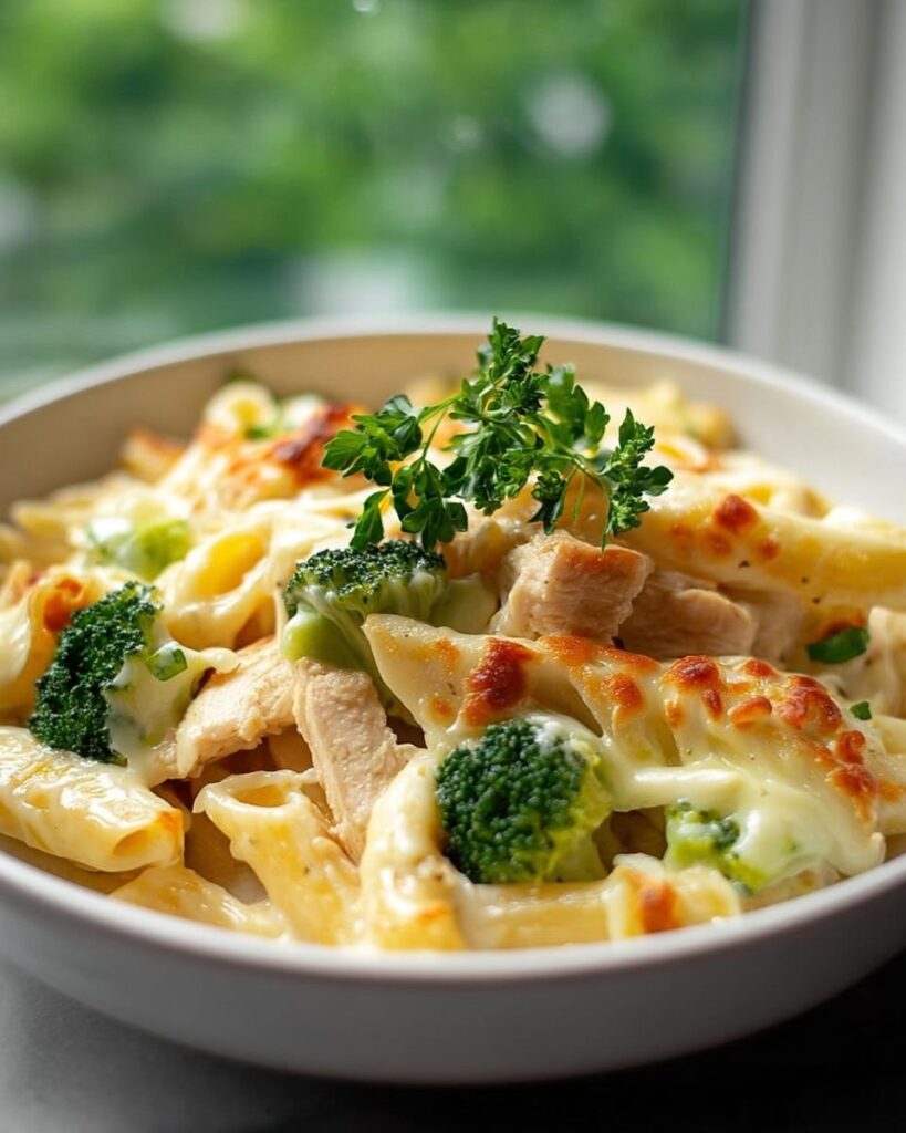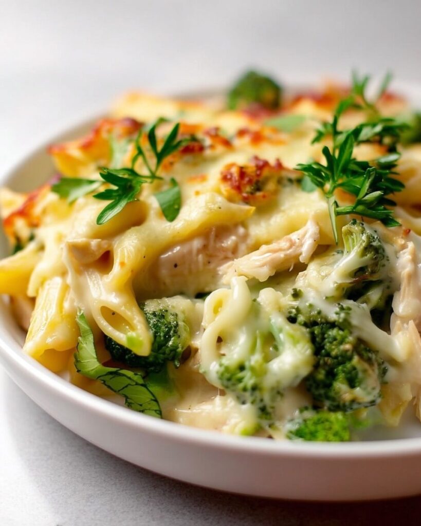 A comforting Chicken and Broccoli Alfredo Bake filled with creamy flavors and tender chicken, perfect for family gatherings.