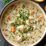 A cozy and heartwarming Chicken and Wild Rice Soup, perfect for chilly days, blending tender chicken with nutty wild rice and aromatic herbs.