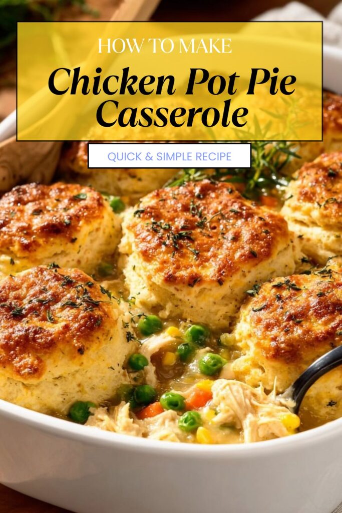 A comforting and heartwarming Chicken Pot Pie Casserole filled with savory chicken, fresh vegetables, and buttery biscuits, perfect for family dinners.