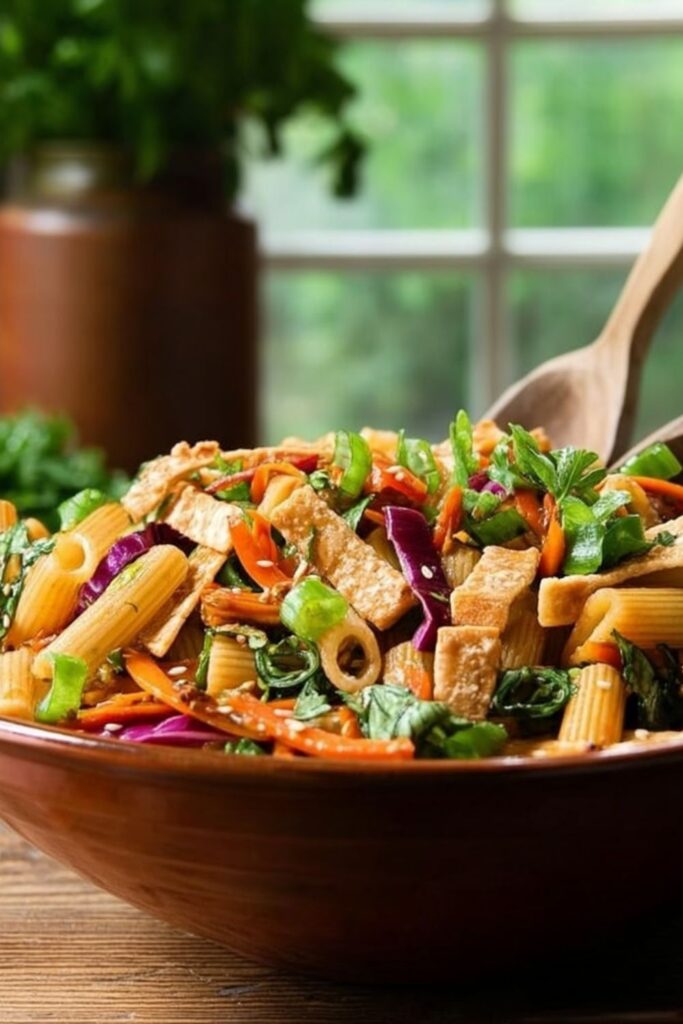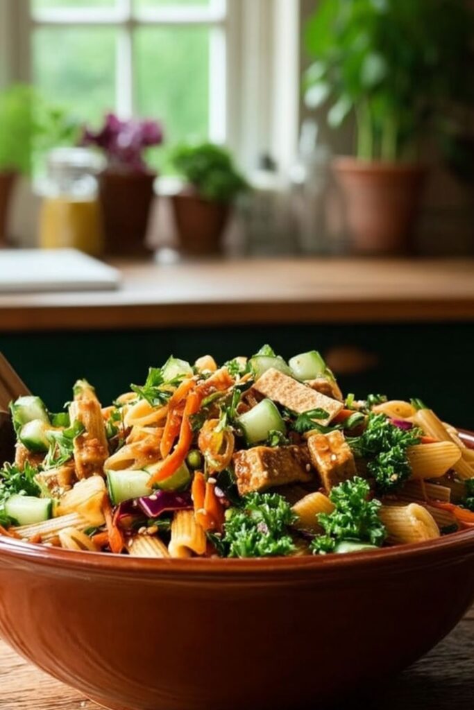 A refreshing blend of pasta, fresh vegetables, and a tangy ginger dressing, perfect for warm days and gatherings.