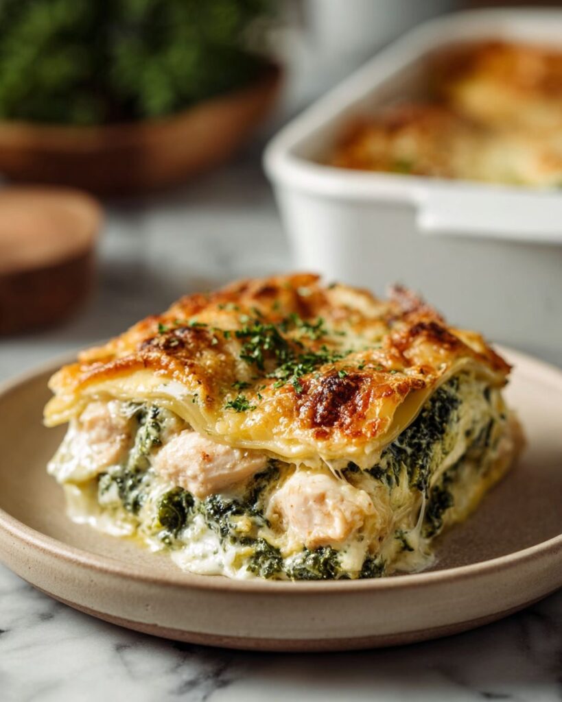 A comforting and indulgent dish featuring layers of tender chicken, béchamel sauce, spinach, and melty cheese, ideal for family gatherings or cozy dinners.