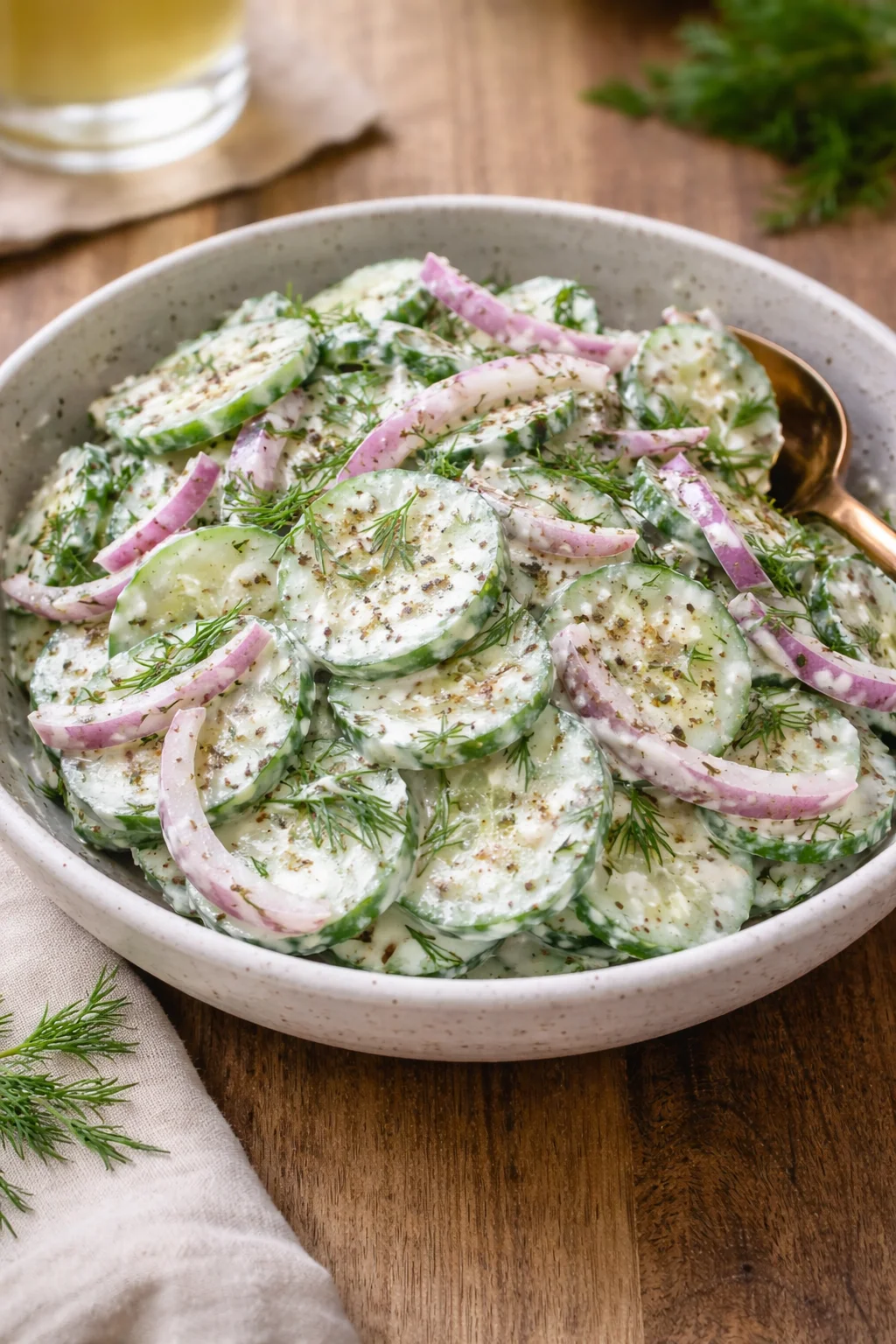 Keywords: creamy cucumber salad, summer salad, refreshing side dish, vegetarian recipes, easy salads