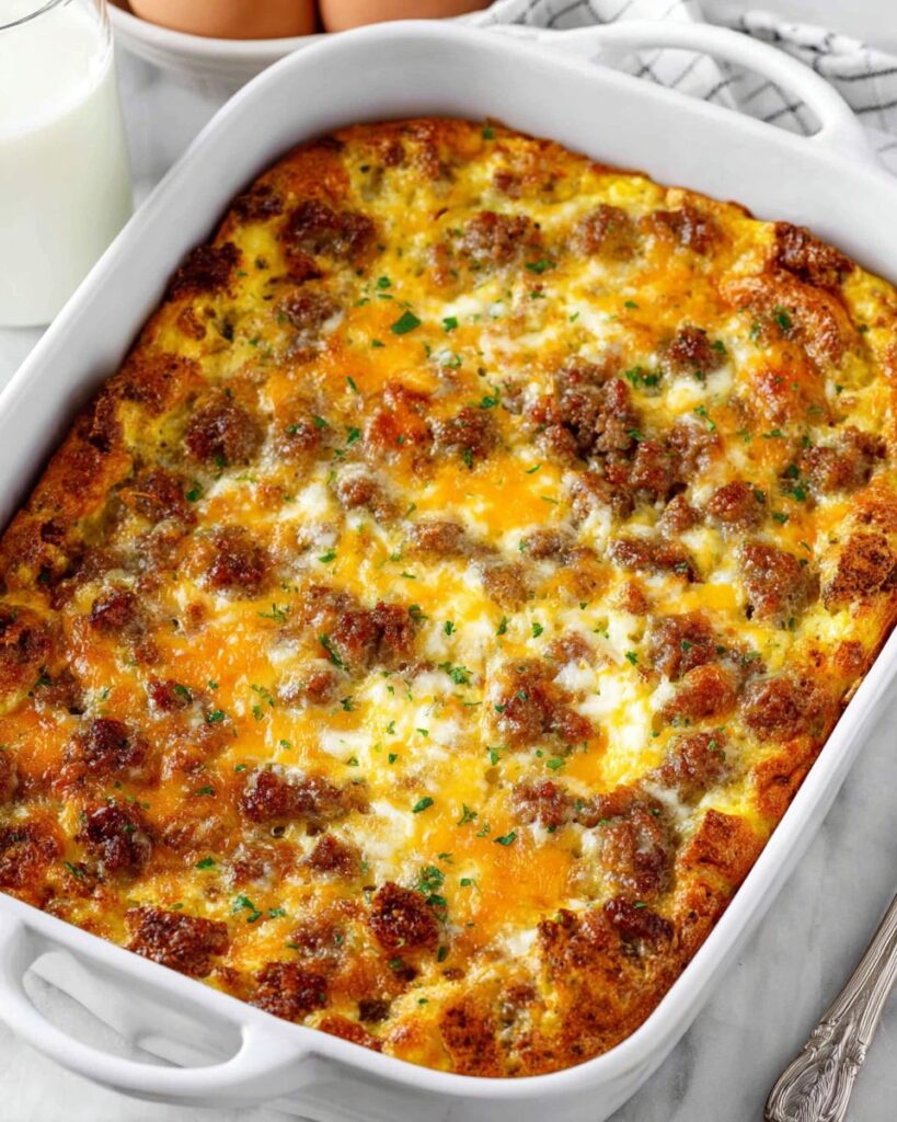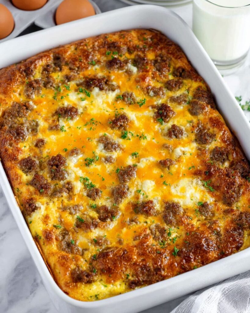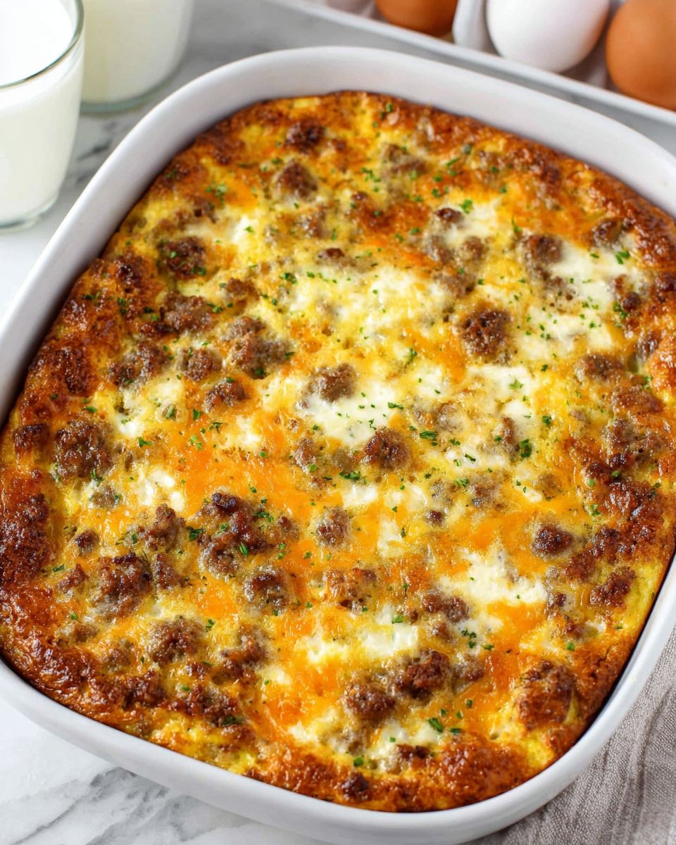 A delicious and easy-to-make casserole combining flaky crescent rolls, hearty breakfast sausage, and creamy eggs, perfect for busy mornings or holiday breakfasts.