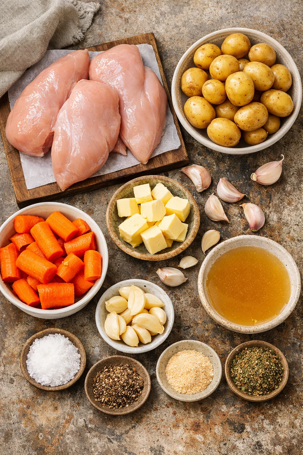 - Pantry friendly ingredients like garlic, butter, broth, and basic seasonings.