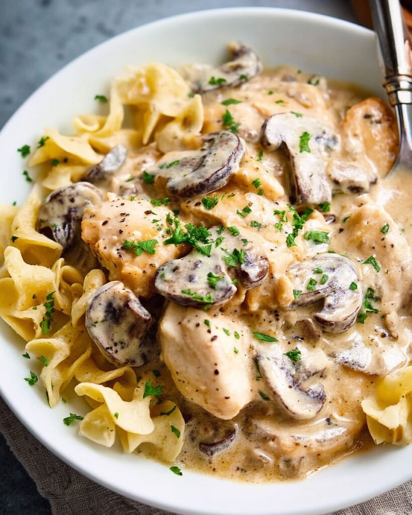 A cozy, flavorful dish combining tender chicken with a rich cream of mushroom sauce.