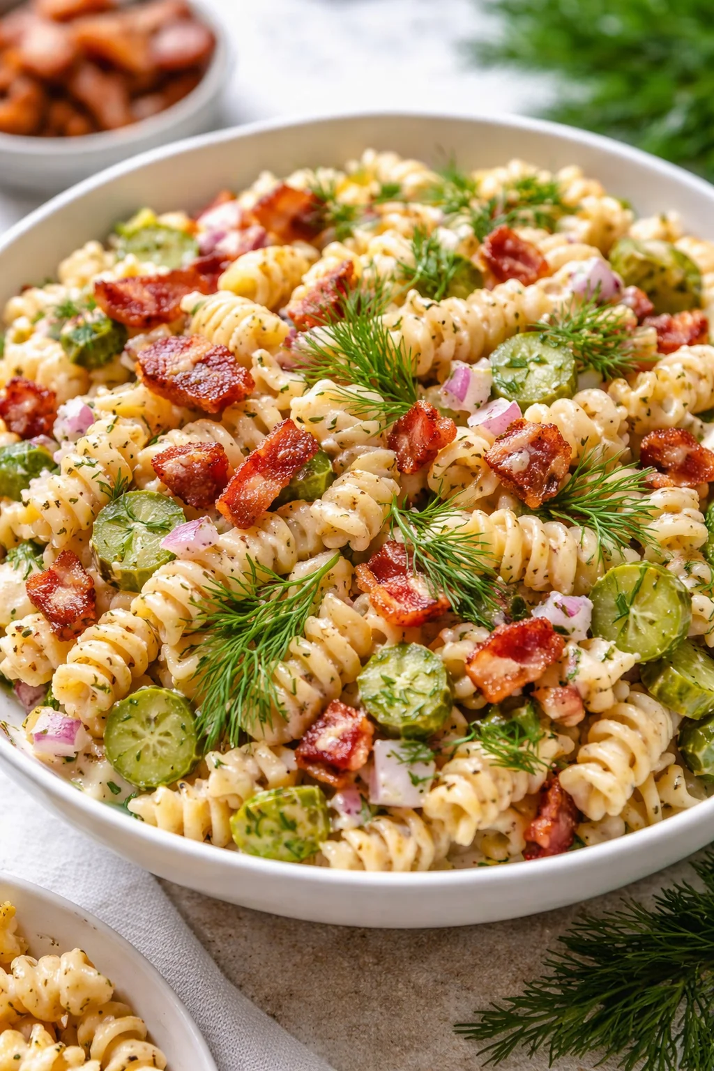 A tangy and smoky pasta salad featuring dill pickles, crispy bacon, and creamy dressing, perfect for any occasion.