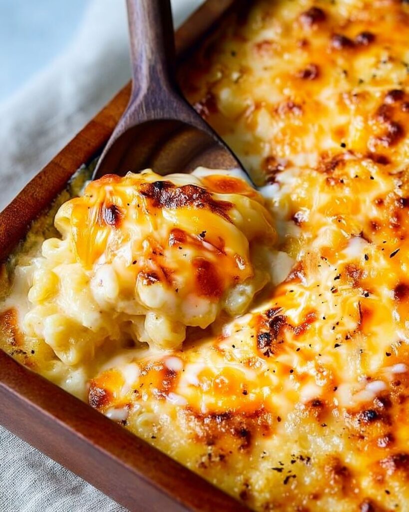 A comforting, creamy baked macaroni and cheese dish that evokes nostalgia and warmth.