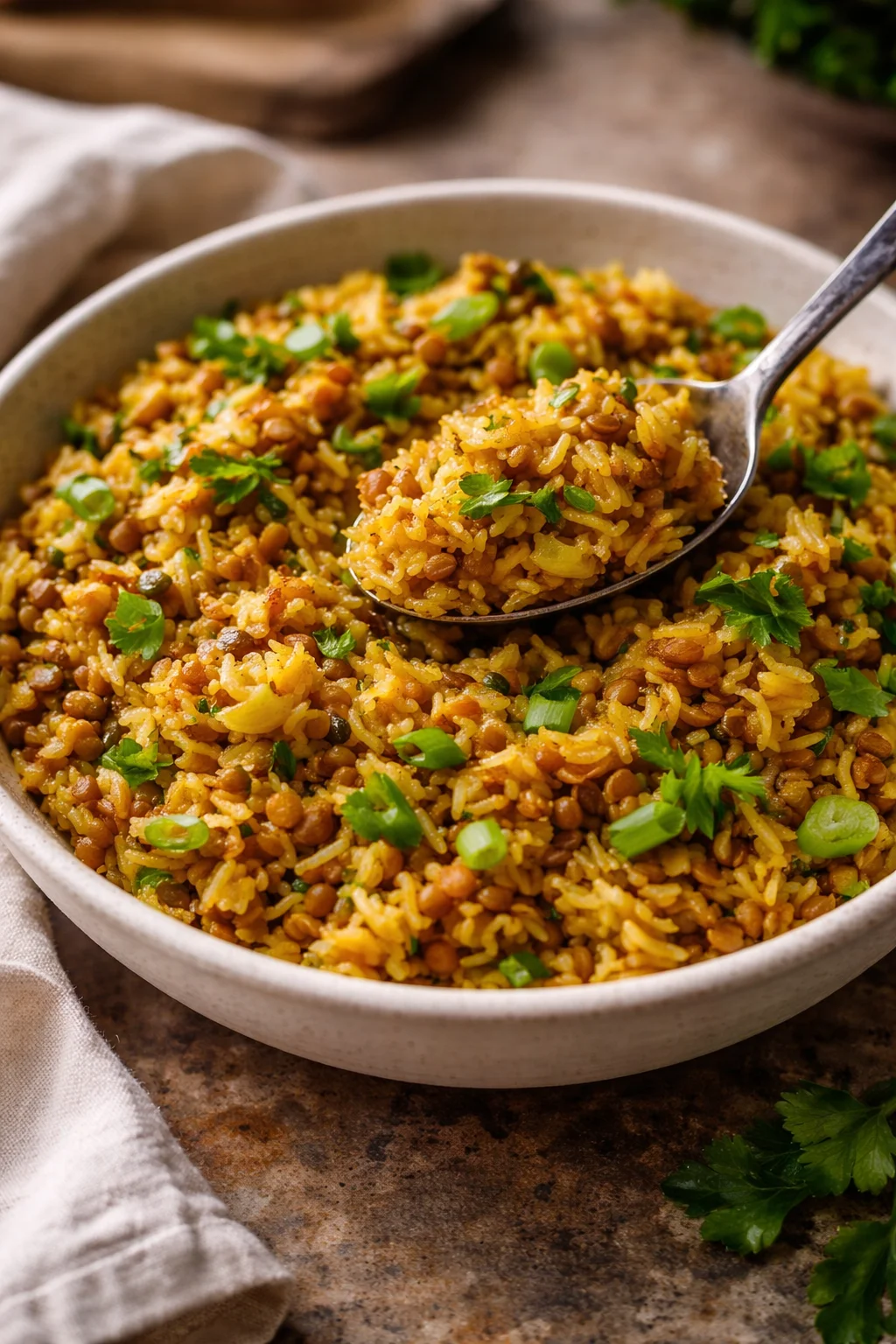 A comforting dish that combines earthy lentils and fluffy rice with aromatic spices and fresh ingredients, perfect for weeknight dinners.