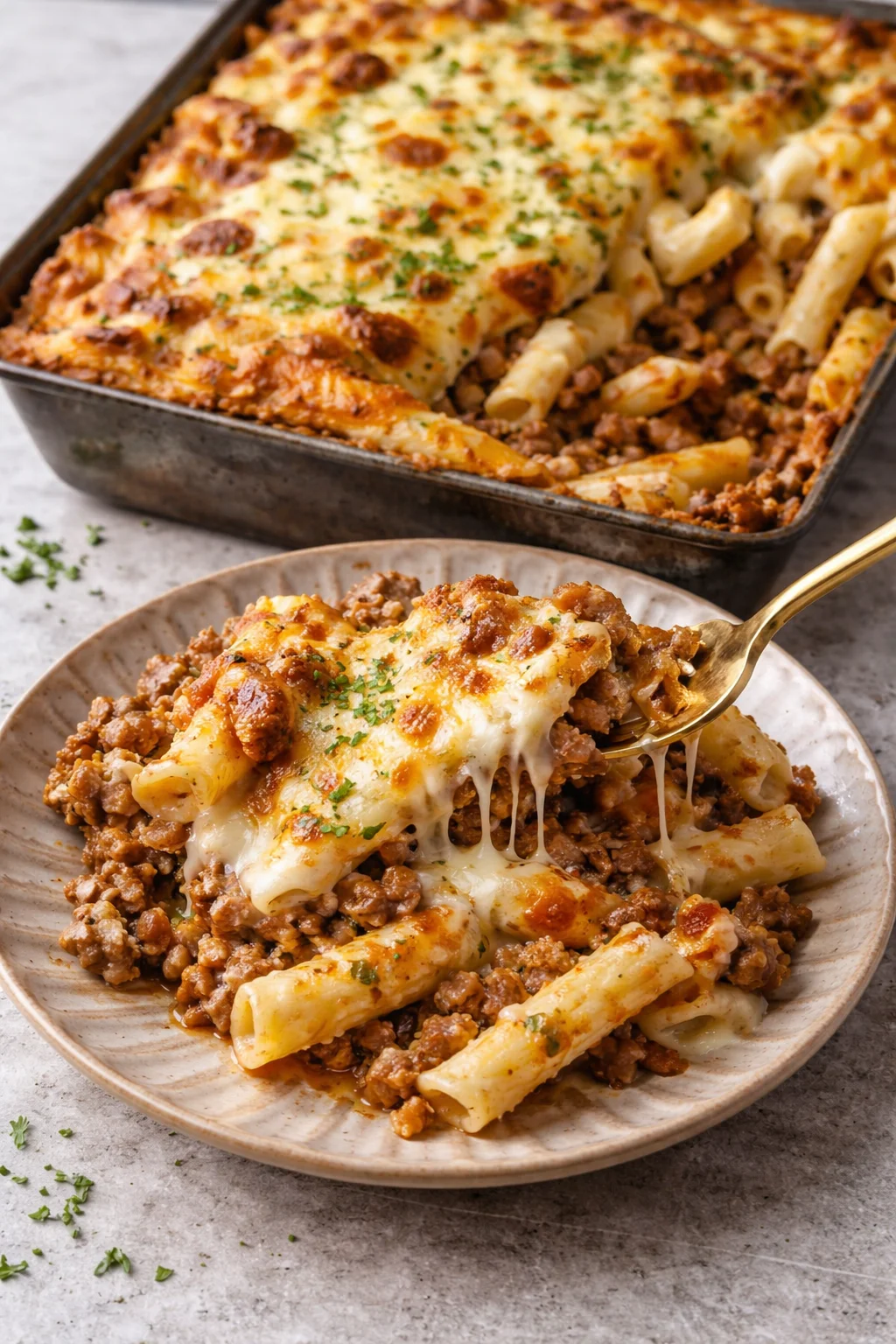 A comforting dish of macaroni layered with a rich meat sauce and creamy béchamel, perfect for family gatherings.