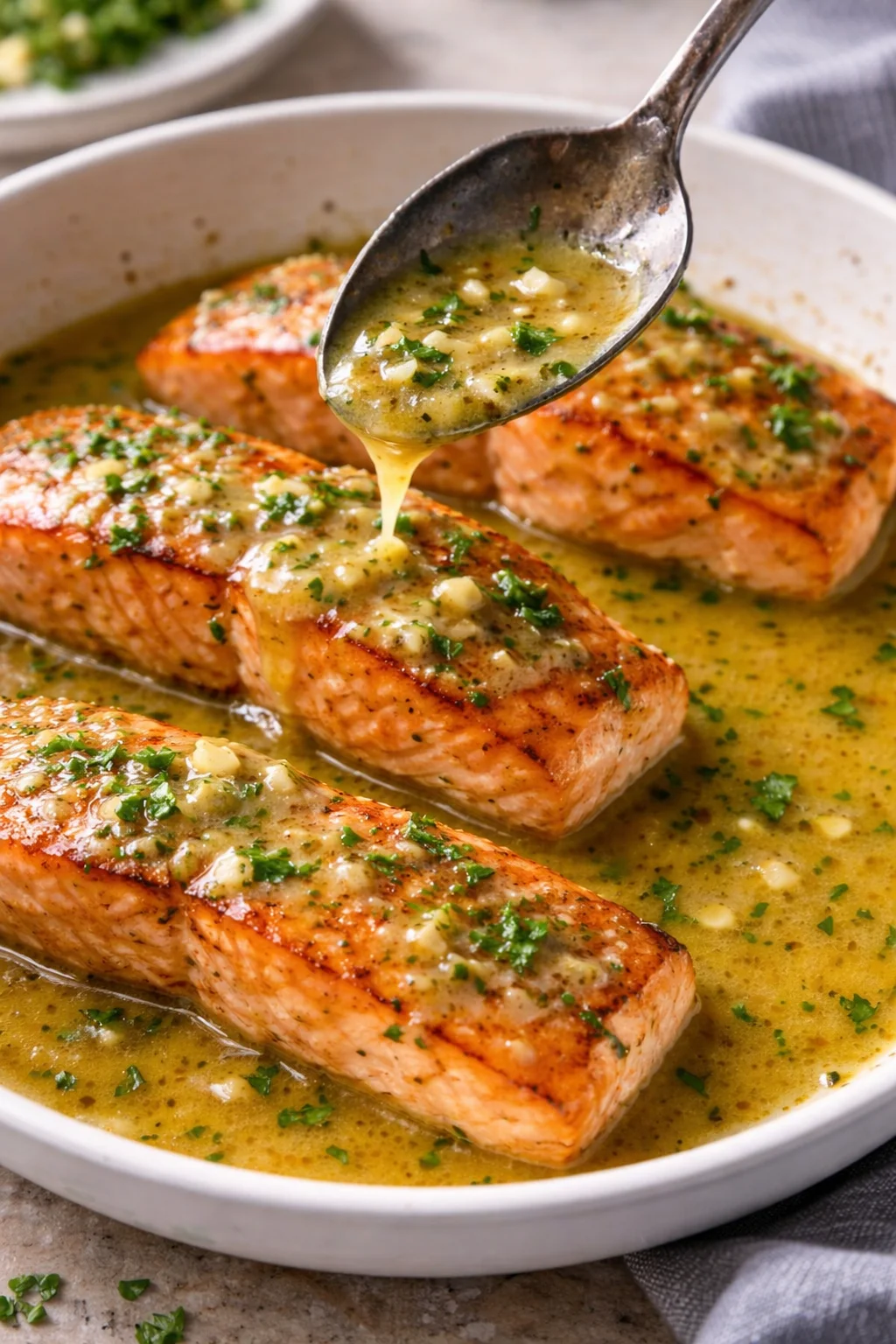 A: You can make the garlic butter ahead and gently reheat it, but it’s best spooned over salmon right after cooking to keep textures bright.