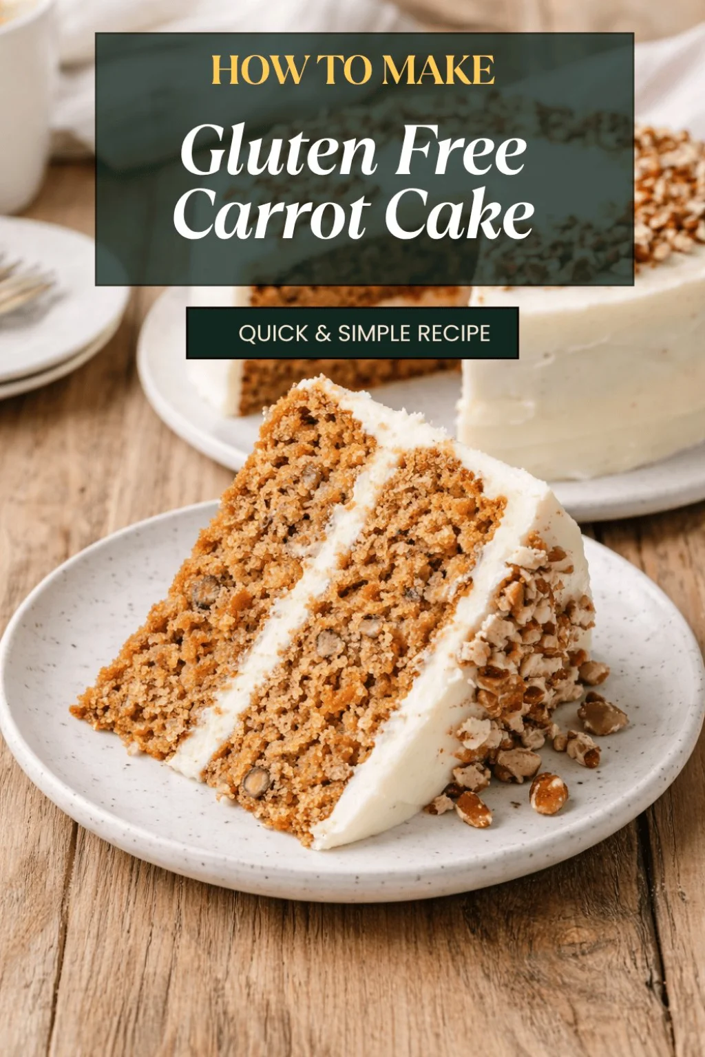 Serve slices of Gluten Free Carrot Cake warm with a thick smear of cream cheese frosting, a scattering of toasted walnuts, and a steaming cup of chai tea. For a brunch spread, pair it with lemony ricotta, fresh berries, and a crisp green salad — even a bright, herbaceous side like a gluten free tabouli lemon herb recipe balances the cake’s sweetness beautifully. Picture a sunlit table, laughter, and a cake that invites you to slow down and savor the moment.