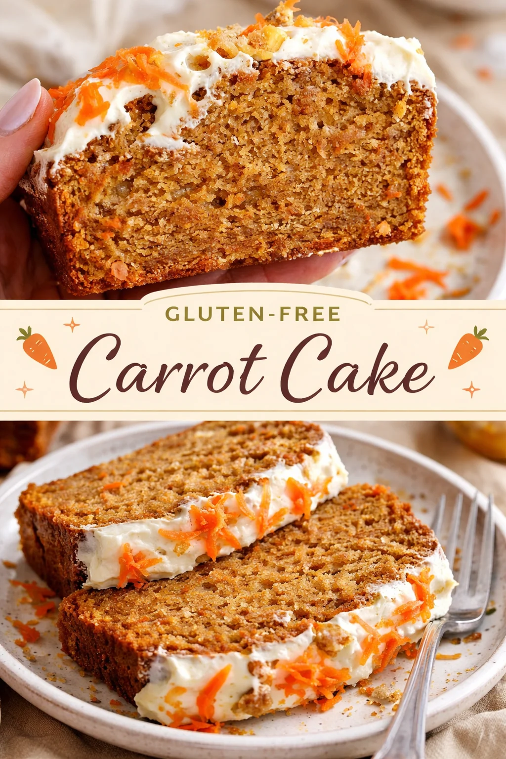 Serve this Gluten-Free Carrot Cake with a strong cup of coffee or a lightly spiced chai for a cozy favorite pairing. For a festive dish, place thin slices on a platter alongside orange segments and candied nuts. If you want to offer a playful duo at a gathering, present small slices next to carrot cake cookies so guests can choose between a forkful of cake and a crisp cookie — both echoing the same warm spices.