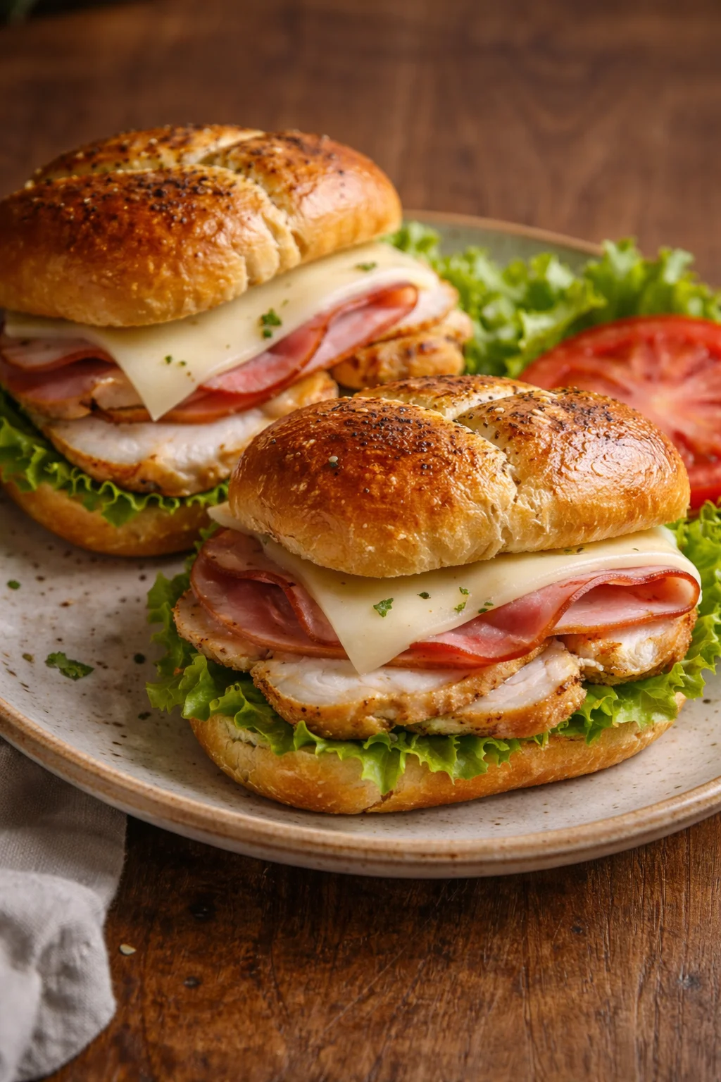 3. Assemble by spreading Dijon mustard and mayonnaise on the inside of each roll. Layer Swiss, warm grilled chicken, ham, and another slice of Swiss.