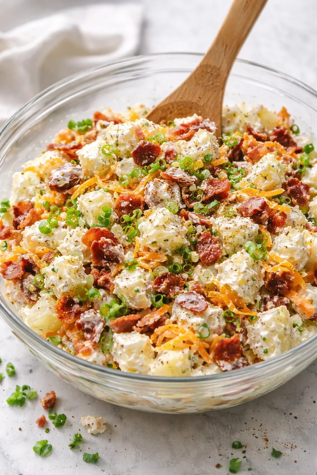 - Combine gently: Add warm potatoes to the dressing while they are still slightly warm so they soak up flavor. Stir gently so they don’t fall apart. Fold in most of the bacon, cheddar, and green onions, reserving some for garnish.