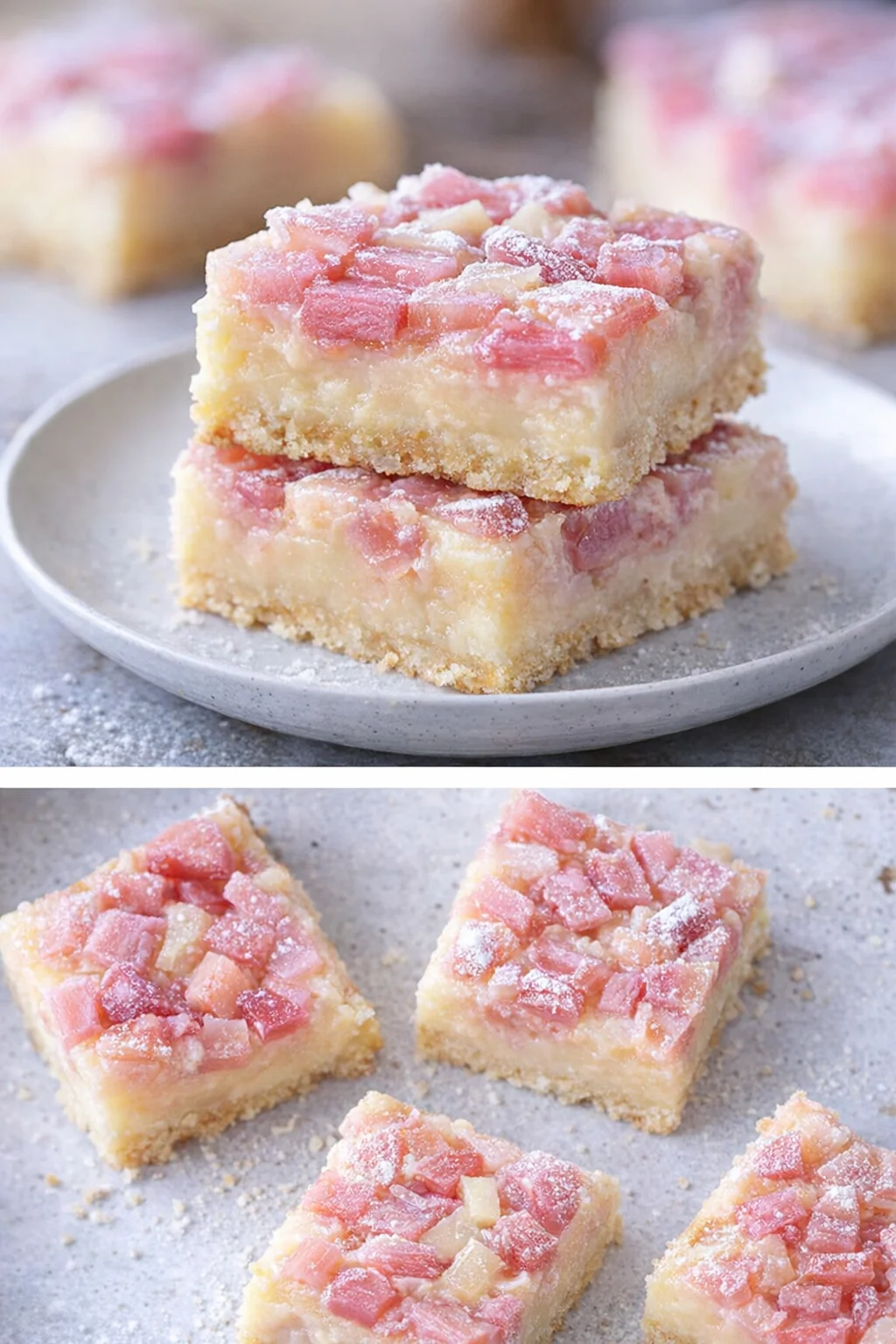 Delicious Rhubarb Custard Bars with a soft buttery crust and creamy rhubarb filling, offering a taste of nostalgia.