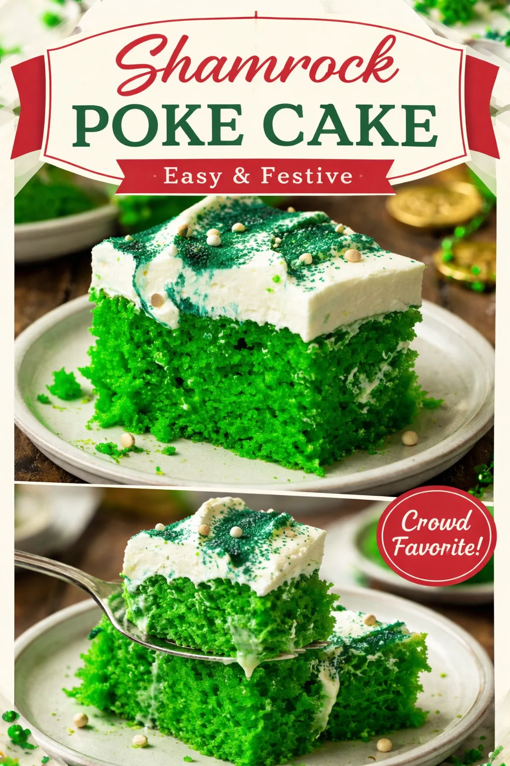 A festive and flavorful Shamrock Poke Cake, perfect for celebrating St. Patrick’s Day with family and friends.