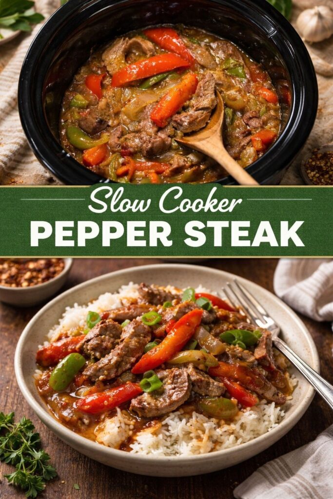 Keywords: pepper steak, slow cooker, dinner recipe, family meal, comforting dish