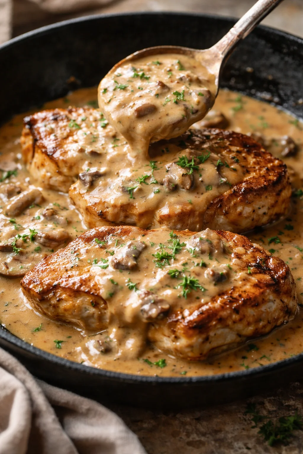 - Brown the chops well — that caramelized crust adds texture and deep flavor to the gravy.