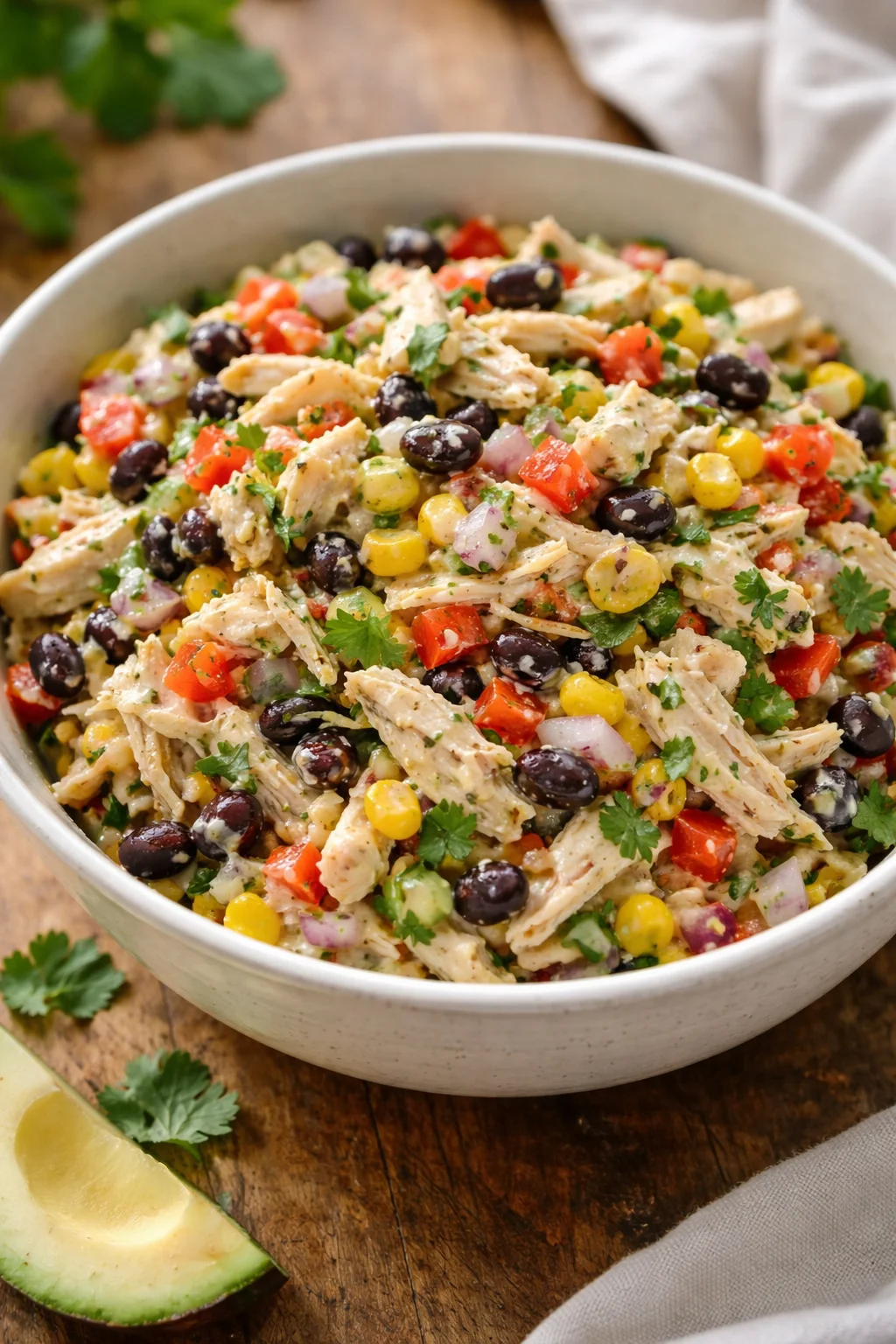 - Make-ahead: Mix the chicken, beans, corn, and dressing a day ahead to let flavors marry; add avocado and greens just before serving for best texture.