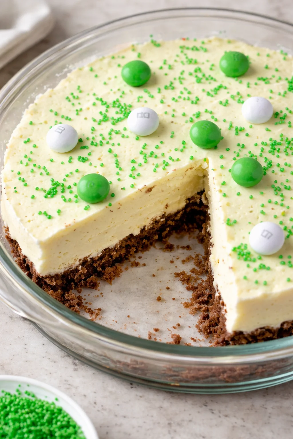 - Serve with Whipped Cream: Once ready to serve, remove the cake from the springform pan. Top with a generous layer of whipped cream, and decorate with green sprinkles and a drizzle of chocolate syrup.