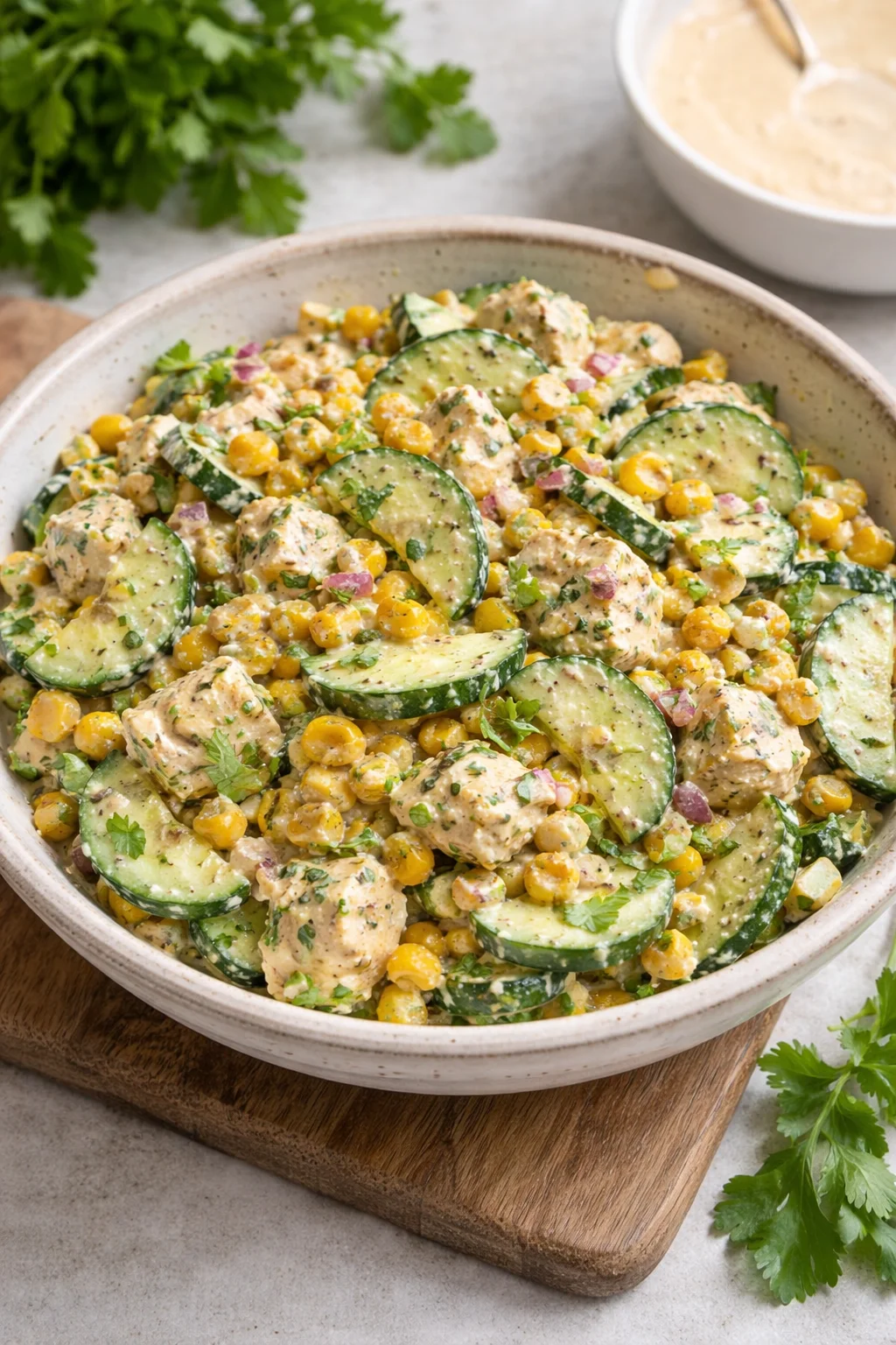 • Balances textures: crunchy cucumber, tender corn, creamy dressing.