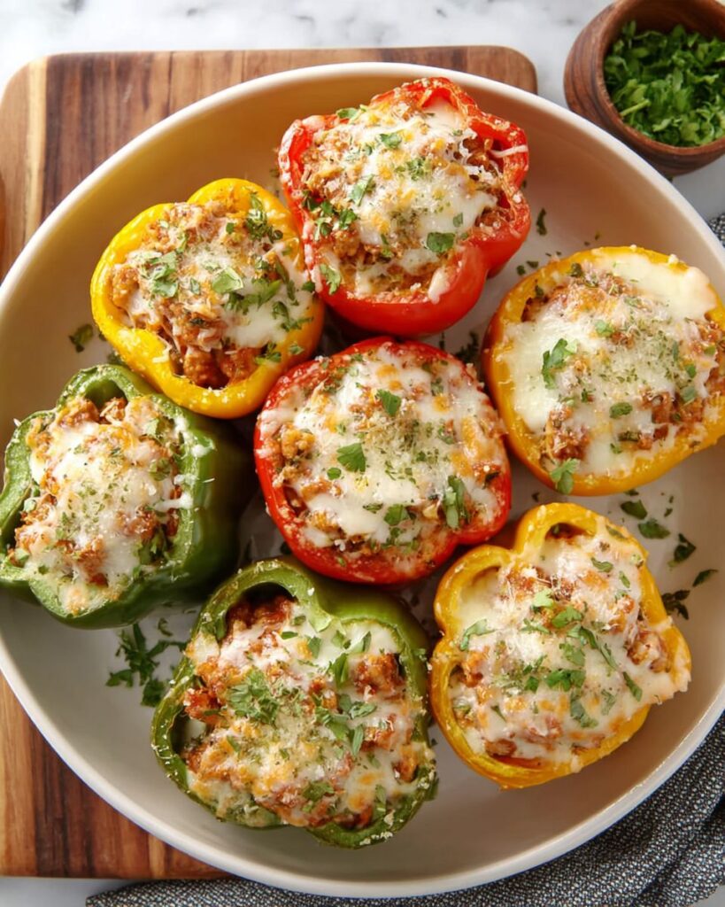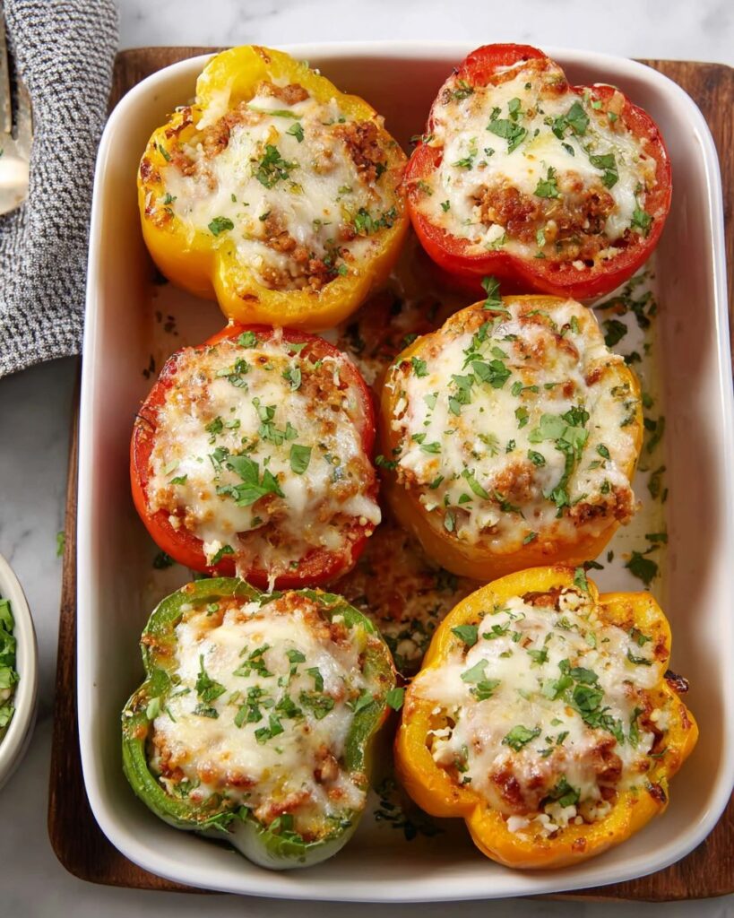 Savory bell peppers stuffed with a flavorful Italian sausage and rice filling, topped with gooey mozzarella cheese.