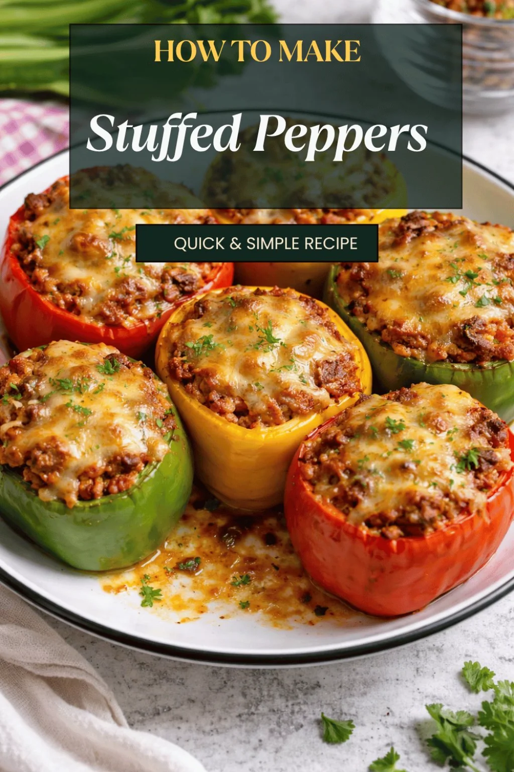 Serve these Stuffed Peppers on a simple platter with a drizzle of olive oil and chopped herbs. Pair with a crisp green salad and crusty bread for soaking up juices, or keep it light with a lemony arugula salad and sparkling water. For a cozy family night, plate them next to mashed potatoes and a glass of red wine; for a festive meal, arrange on a warmed serving tray and sprinkle pomegranate seeds for a pop of color.