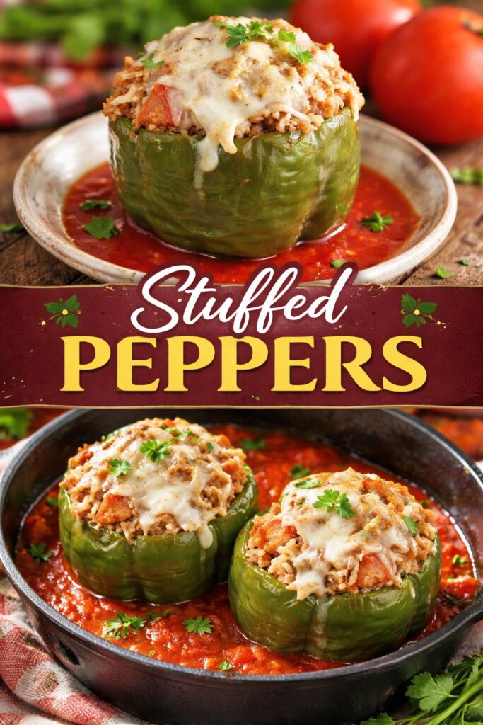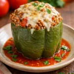 Heartwarming stuffed peppers filled with lean meat, rice, and topped with cheese, perfect for family gatherings.