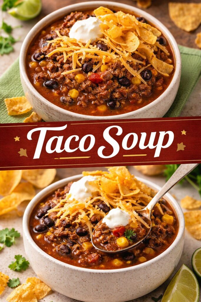 Serve this comforting Taco Soup with a variety of sides to enhance the experience. Pair it with crunchy tortilla chips, melt-in-your-mouth cornbread, or a fresh green salad. A cold beverage, such as iced tea or a light beer, can complement the rich flavors perfectly. Imagine cozying up with a steaming bowl on a chilly evening, or serving it at a festive gathering where everyone gets to add their favorite toppings.