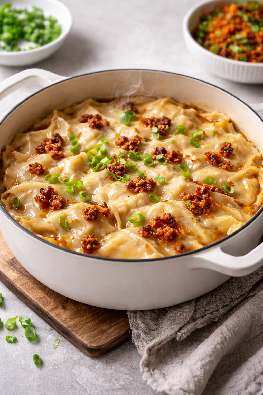 A comforting dish that perfectly embodies the flavors of dumplings layered in a rich, cheesy, saucy embrace.